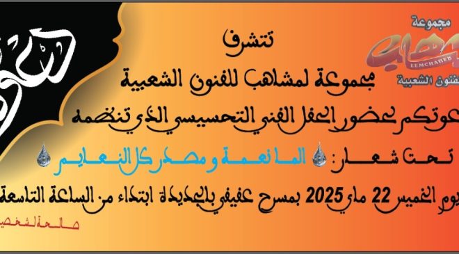 موعد الجمهور الجديدي يوم الخميس 22 ماي 2025 ، على الساعة التاسعة ليلا بمسرح عفيفي،مع حفل فني من تقديم مجموعة لمشاهب للفنون الشعبية.